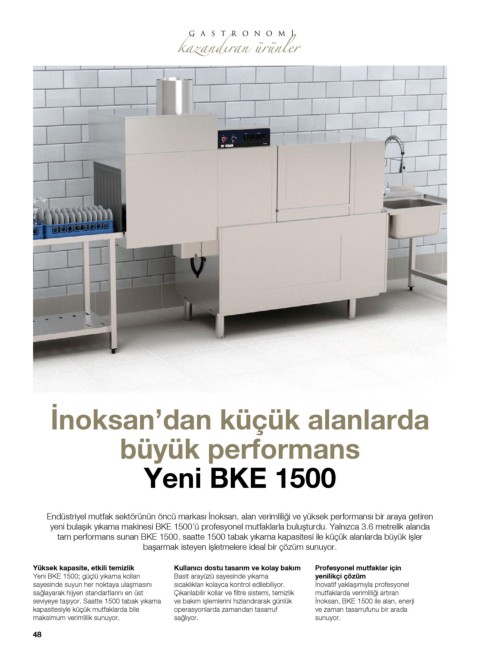 seviyeye taşıyor. Saatte 1500 tabak yıkama ve bakım işlemlerini hızlandırarak günlük İnoksan, BKE 1500 ile alan, enerji